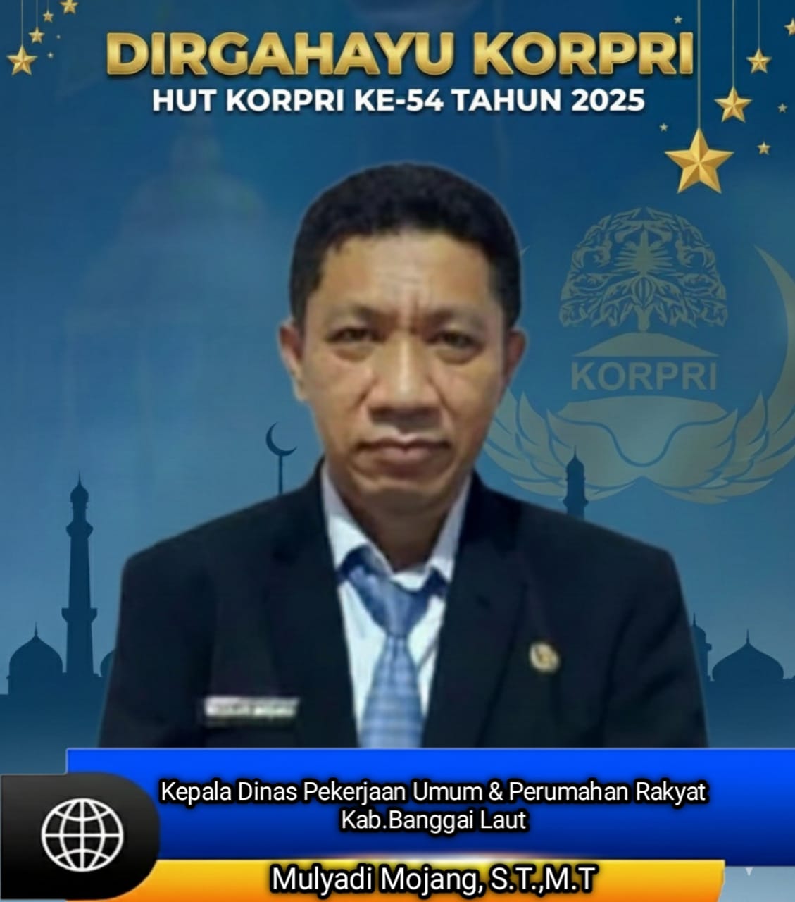 Dirgahayu Korps Pegawai Republik Indonesia (KORPRI) ke-54 Tahun 2025 Kepala Dinas Pekerjaan Umum & Perumahan Rakyat (PUPR) Kabupaten Banggai Laut, Bapak Mulyadi Mojang, S.T., M.T., mengucapkan selamat memperingati hari jadi KORPRI. Melalui pesan Media Publikasi, Mulyadi menampilkan semangat optimisme. Baginya, KORPRI bukan sekadar seragam, melainkan simbol dedikasi dalam membangun negeri. Sebagai nahkoda di Dinas PUPR, ia menyadari bahwa tantangan infrastruktur ke depan membutuhkan ASN yang tangguh dan adaptif. Semoga di usia ke-54 ini, KORPRI semakin jaya, profesional, dan sejahtera. Mari teruskan semangat pengabdian, berkarya tanpa batas untuk membangun infrastruktur yang unggul dan melayani masyarakat Banggai Laut dengan prima. KORPRI Maju, Indonesia Tumbuh!
