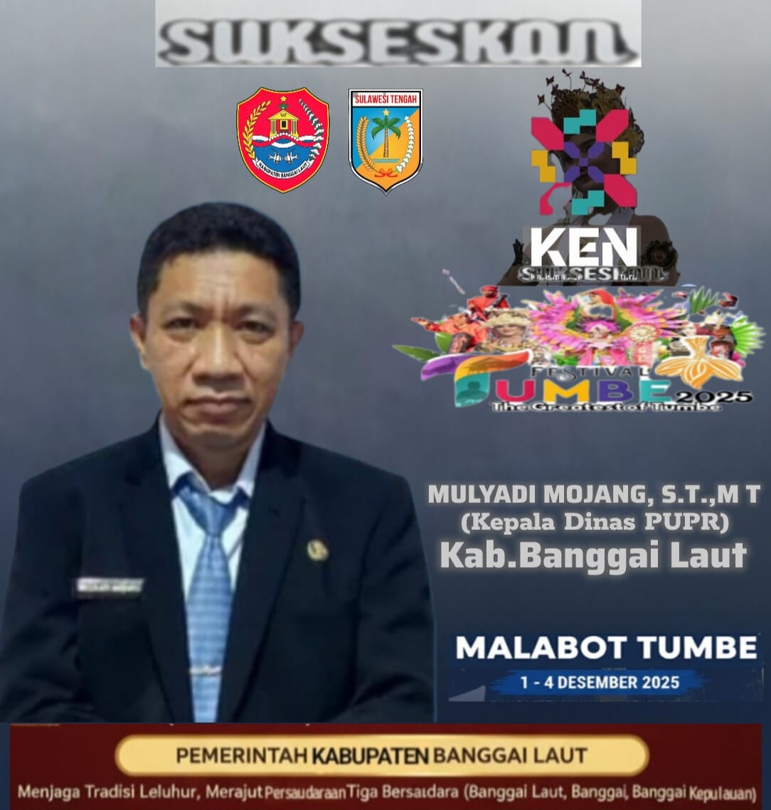 Kepala Dinas Pekerjaan Umum & Perumahan Rakyat, Kabupaten Banggai Laut, MULYADI MOJANG, S.T.,M.T. Mengucapkan: Dukung & Sukseskan Festival dan Kegiatan Adat Malabot Tumbe 2025.