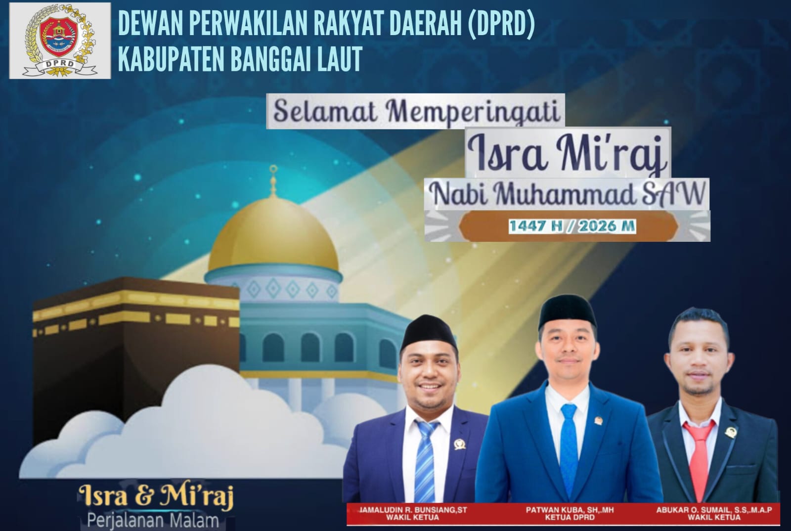 Dewan Perwakilan Rakyat Daerah (DPRD) Kabupaten Banggai Laut, Menyampaikan Ucapan: “Selamat Memperingati Isra Mi’raj Nabi Muhammad SAW 1447 Hijriah / 2026 Masehi.”