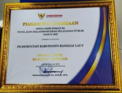 Penghargaan tersebut dituangkan dalam Piagam Penghargaan Ombudsman RI yang secara resmi diberikan kepada Pemerintah Kabupaten Banggai Laut sebagai bentuk apresiasi atas komitmen dan kinerja dalam penyelenggaraan pelayanan publik yang berkualitas, transparan, dan akuntabel.