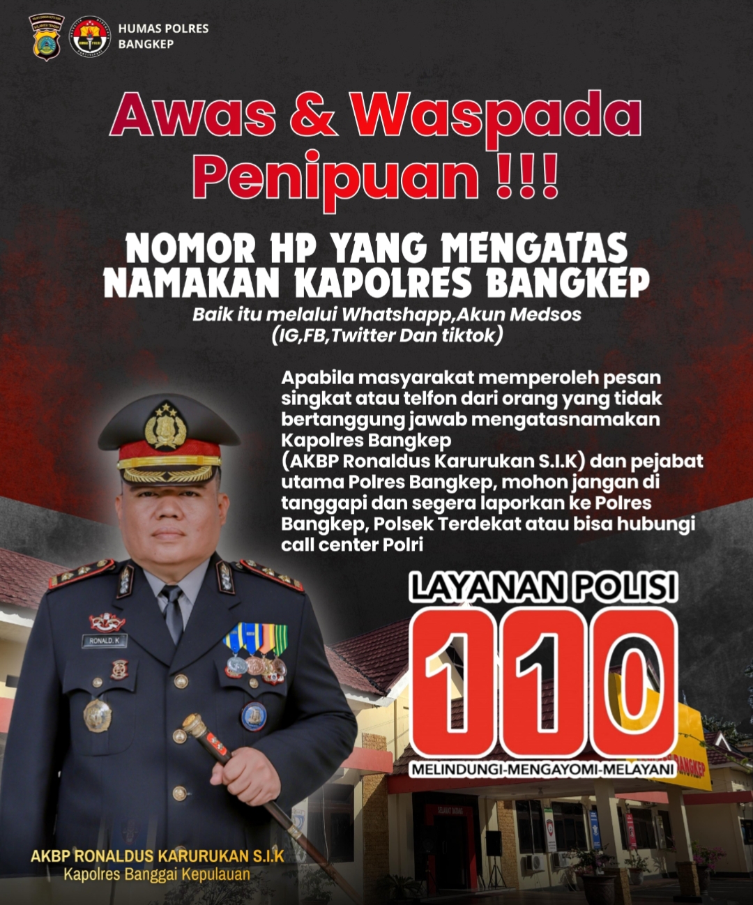 Melalui rilis resmi Humas Polres Bangkep, disebutkan bahwa terdapat oknum tidak bertanggung jawab yang mencatut nama Kapolres Bangkep, AKBP Ronaldus Karurukan, S.I.K, dengan menggunakan nomor handphone serta akun media sosial seperti WhatsApp, Instagram, Facebook, Twitter, hingga TikTok untuk melancarkan aksinya.