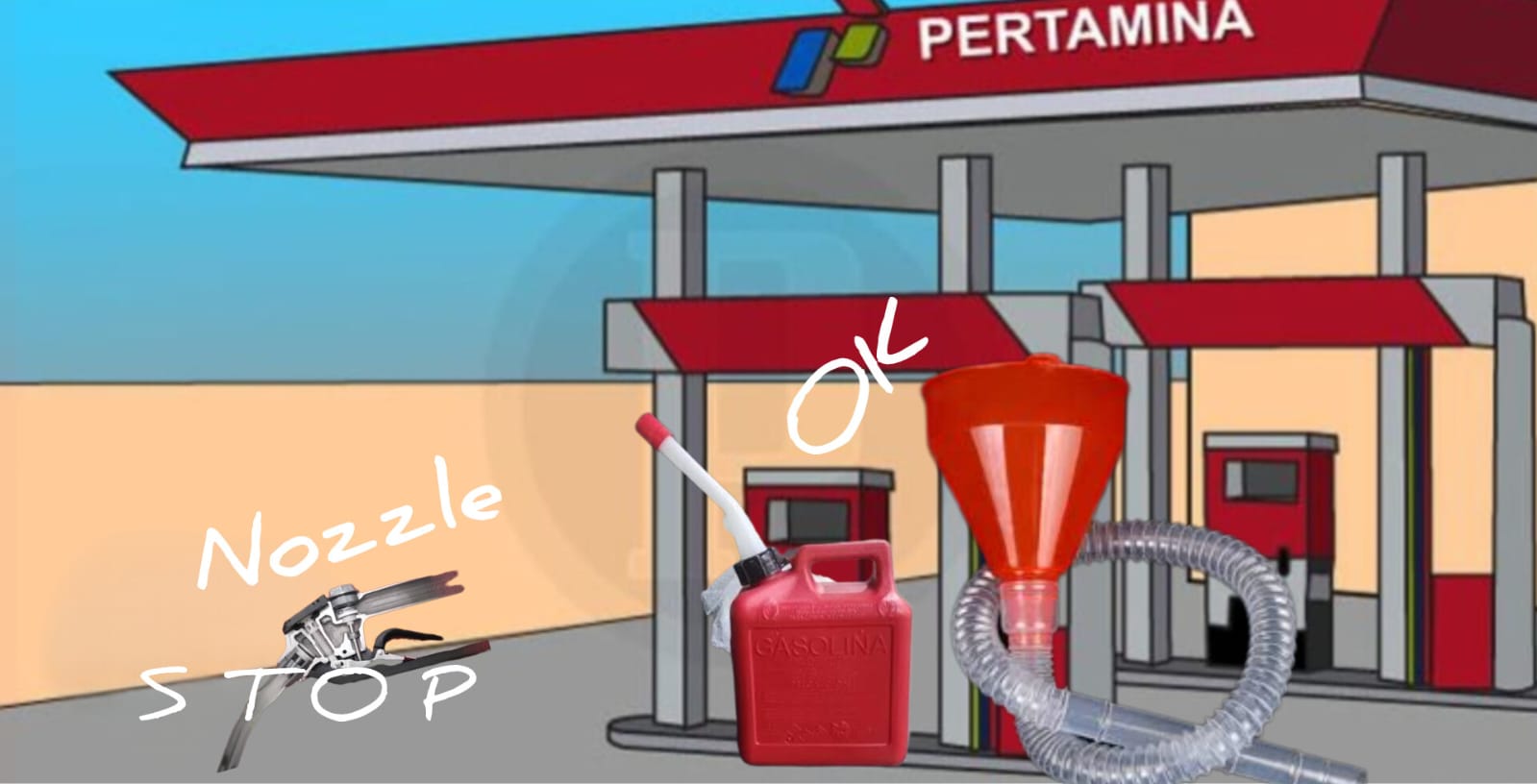 Pelanggaran SOP dan RisikoPengisian BBM di SPBU yang tidak menggunakan nozzle standar, misalnya menggunakan jerigen plastik, selang manual, atau botol, melanggar aturan keselamatan dan distribusi BPH Migas/Pertamina. Praktik ini berpotensi memicu kebakaran akibat listrik statis dan termasuk penyalahgunaan distribusi BBM bersubsidi.