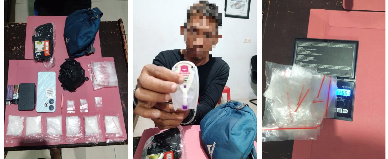 Saat dilakukan penggeledahan badan, petugas menemukan 9 paket sabu yang terdiri dari 6 paket besar dan 3 paket kecil dengan berat total sekitar 126,53 gram. Enam paket besar ditemukan di kantong celana kanan tersangka yang dibungkus kantong plastik hitam dan diselipkan dalam kaos kaki warna hitam, sementara tiga paket kecil ditemukan di dalam tas samping merek Eiger warna biru milik pelaku.