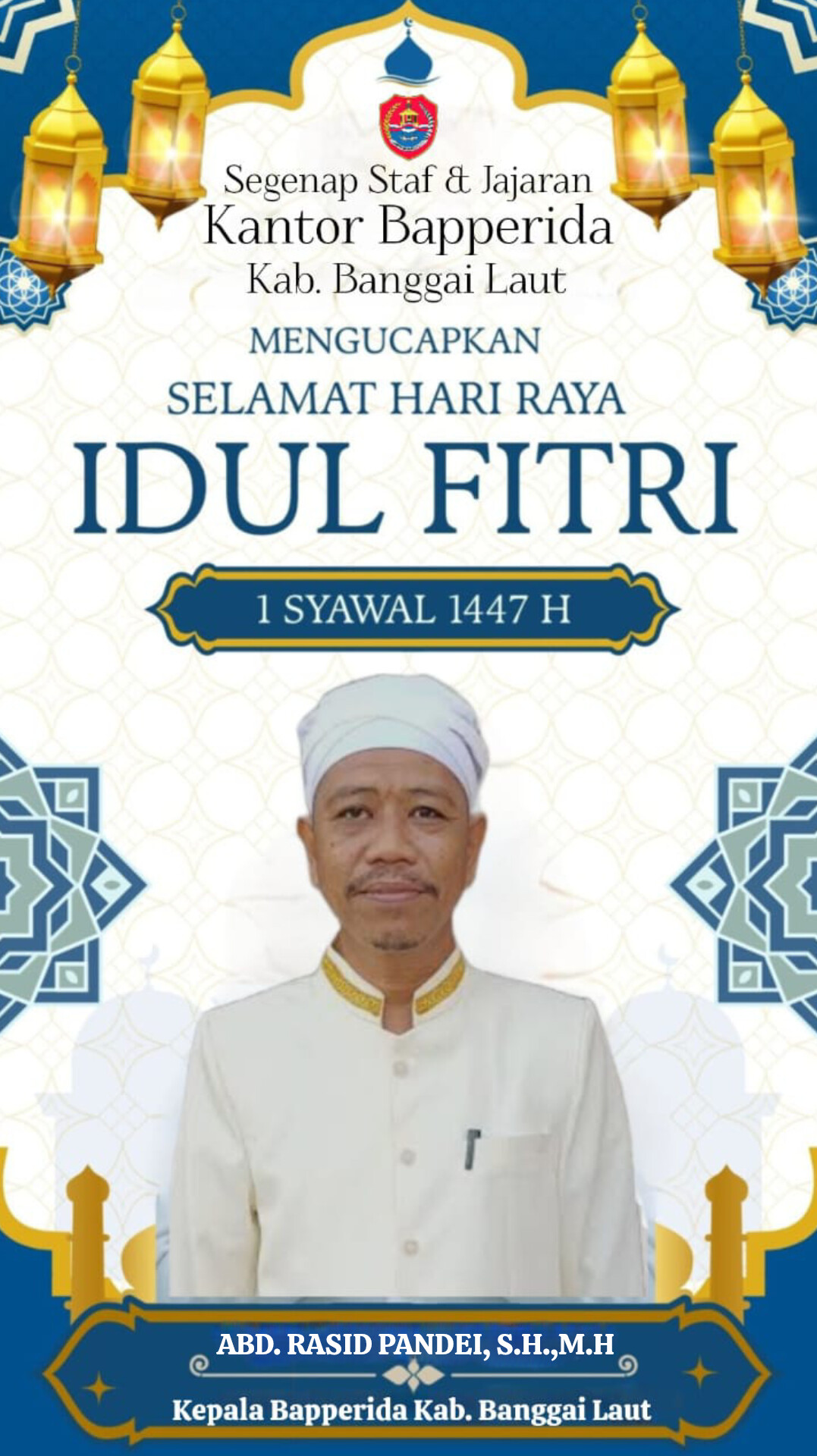 Kepala BAPPERIDA, ABD. RASID PANDEI, S.H.,M.H Beserta Segenap Staf & Jajaran Badan Perencanaan Pembangunan, Riset dan Inovasi Daerah (BAPPERIDA) Kab. Banggai Laut. Mengucapkan: Selamat “IDUL FITRI” 1447 Hijrah, Mohon Maaf Lahir & Batin.