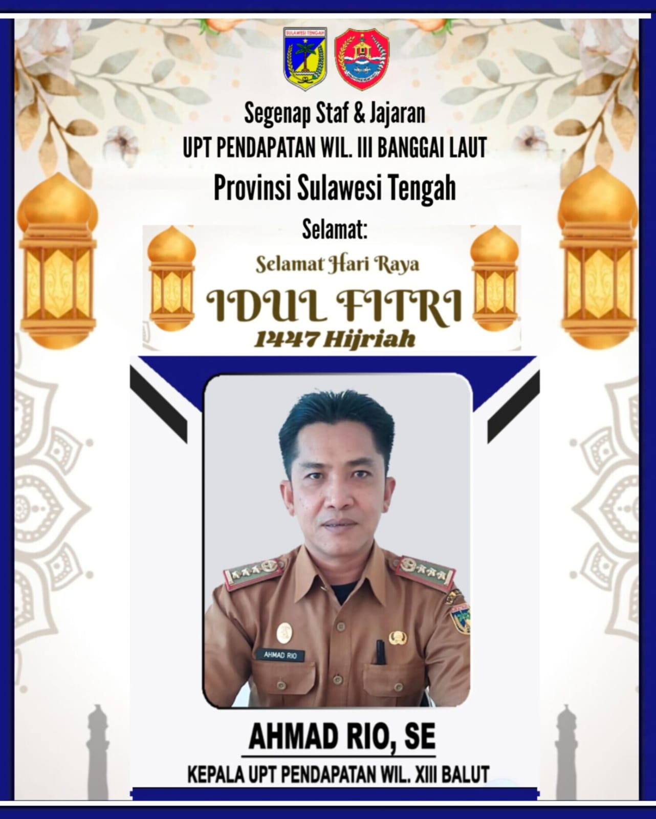 Kepala UPT, AHMAD RIO, S.E Beserta Segenap Staf & Jajaran UPT PENDAPATAN WILAYAH XIII SAMSAT Banggai Laut. Mengucapkan: Selamat Hari Raya "IDUL FITRI" 1447. H / 2026. M. Minal Aidin Wal-Faidzin Mohon Maaf Lahir & Bathin.