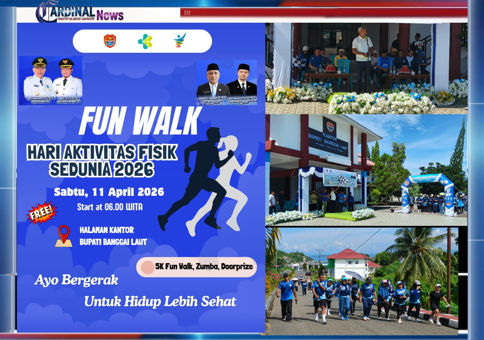 BANGGAI LAUT, CARDINALNews.co.id – (11/04/2026). Bupati Banggai Laut, Sofyan Kaepa, S.H., M.Si., secara resmi melepas kegiatan Fun Walk dalam rangka peringatan Hari Aktivitas Fisik Sedunia tahun 2026, yang dilaksanakan pada Sabtu (11/04/2026).