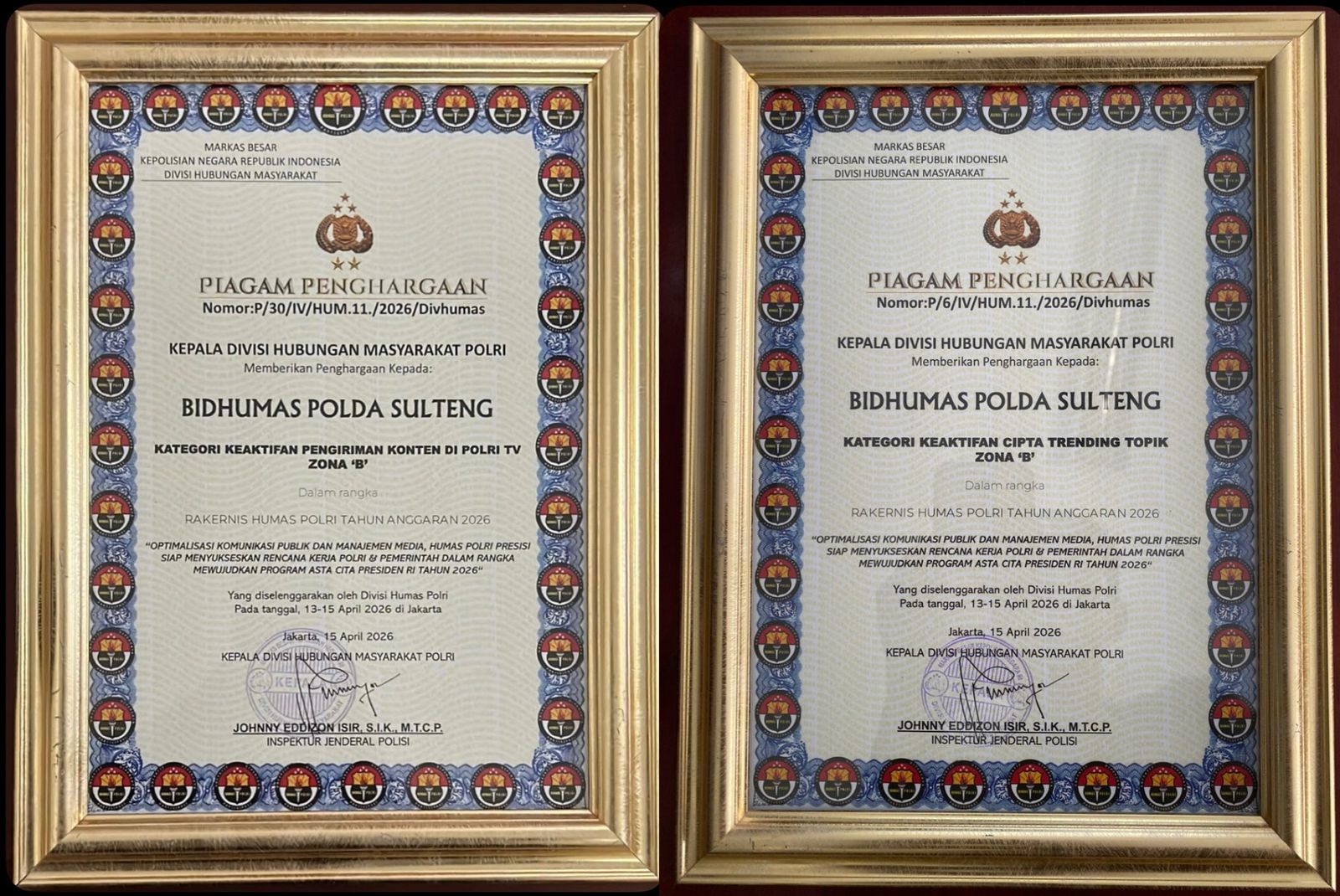 Jakarta, CARDINALNews.co.id — (20/042026). Kepala Divisi Hubungan Masyarakat Polri, Jonny Eddizon Isir, memberikan piagam penghargaan kepada Bidang Humas Polda Sulawesi Tengah peringkat ke III atas keaktifan dalam pengiriman konten ke platform Polri TV untuk Zona “B” dan peringkat ke III keaktifan Cipta Trending Topik Zona “B”.